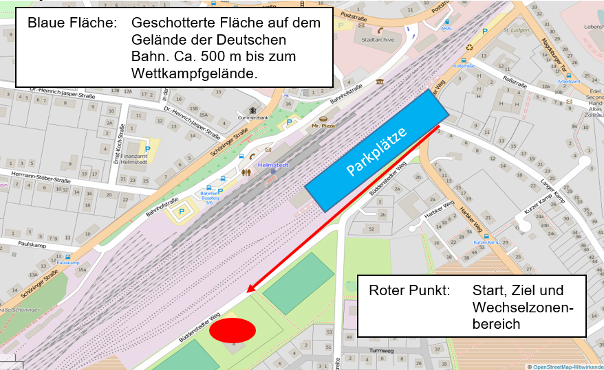 Wechselzone / Umkleide / Startunterlagenausgabe befinden sich auf dem Gelände des TSV Fichte Helmstedt (Büddenstedter Weg). Es ist zu beachten, dass während der Veranstaltung der Parkplatz „Invitel“ abgesperrt ist.
